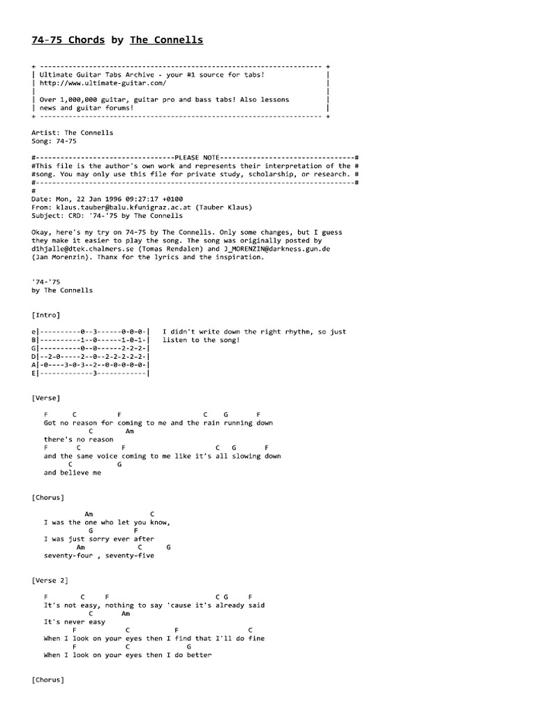 Scopri i nostri corsi di chitarra per tutti i livelli. Free 74/75 tab for the acoustic guitar. Learn to play the connells with easy chords for beginners. Znajdź najlepsze gitarowe chwyty do 74/75. The song was originally posted by d1hjalle@dtek.chalmers.se (tomas rendalen) and j_morenzin@darkness.gun.de thanx for the lyrics and the inspiration. If you are a premium member, you have total access to our video lessons. G#m b i was the one who let you know. Chordify gives you the chords for any song. 74/75 uke tab by the connells, song arranged with 5 chords (am,c,g,f,c/b) for the ukulele soprano. Only some changes, but i guess they make it easier to play the song. They are designed as practice tools to supplement your other learning methods. Play song with guitar, piano, bass, ukulele. If you find a wrong bad to me from the connels, click the correct button above.